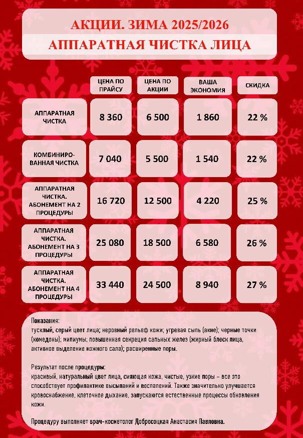 Здесь у вас есть возможность записаться к косметологу и выполнить чистку лица. Глубокое очищение стоит периодически делать при абсолютно любой коже - жирной или склонной к сухости, молодой и не очень. (Главное правильно подобрать вид процедуры, а с этим хорошо справятся наши мастера!) Дело здесь не только в красоте - благодаря глубокому очищению кожи клетки начинают лучше снабжаться кислородом, нормализуется работа сальных желез, активизируются внутриклеточные регенеративные процессы. А возможность избавиться от комедонов и визуальное омоложение - это приятный бонус, который мы получаем, заботясь о своем здоровье.